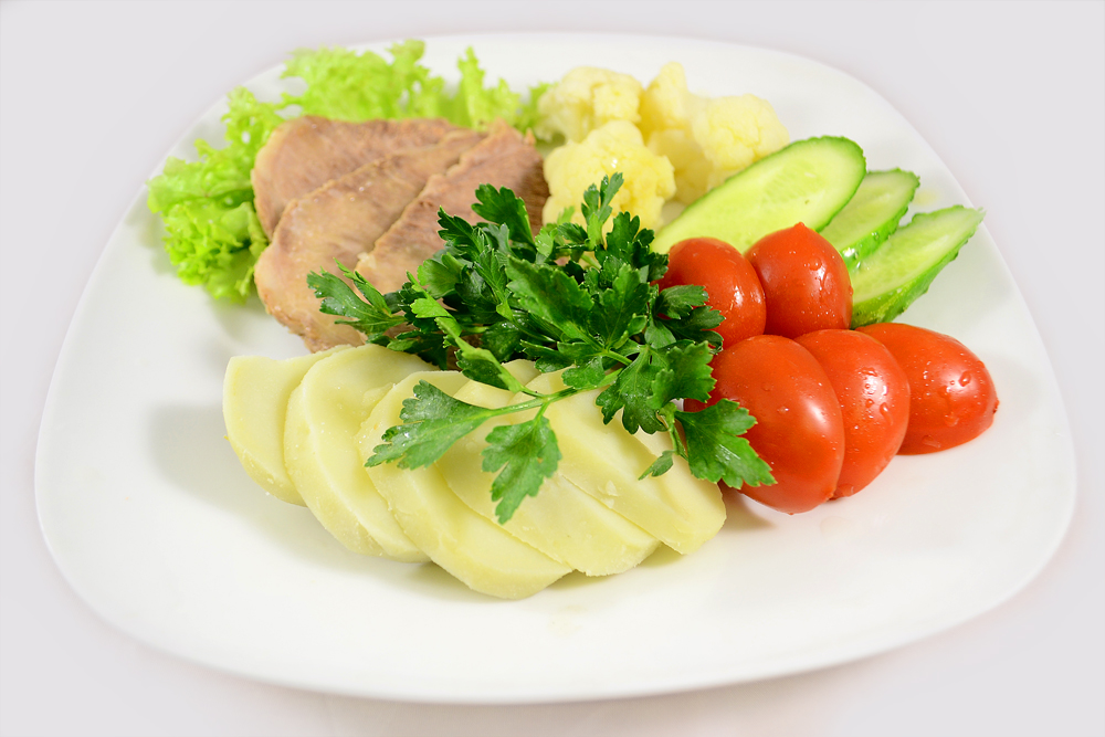 Отварная говядина, отварной картофель, отварная цветная капуста, помидор свеж., огурец свеж. Энерг. ценность на 100 гр - 254 Ккал
