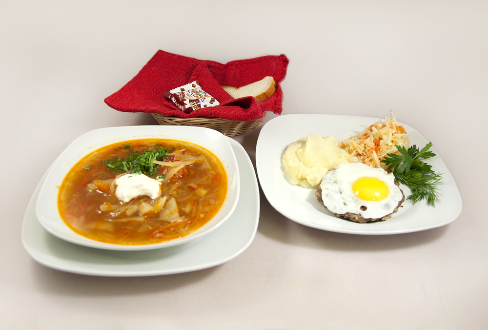 Щи, бифштекс из говядины, картофельное пюре, салат, хлеб, конфета