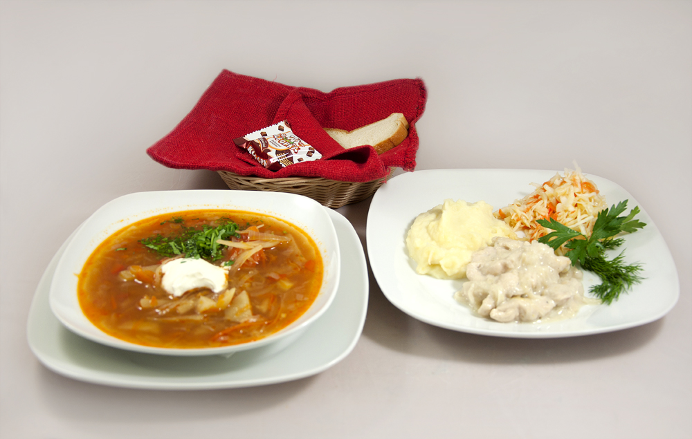 Щи, люля-кебаб, картофельное пюре, салат, хлеб, конфета
