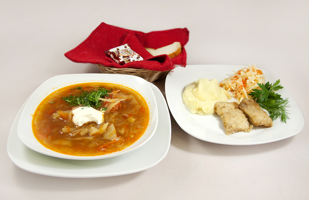 Щи, минтай жаренный, картофельное пюре, салат, хлеб, конфета