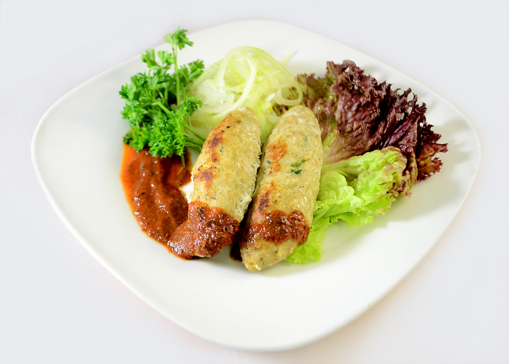 Курица, лук, зелень, томатный соус. Энерг.ценность на 100 гр - 135 Ккал