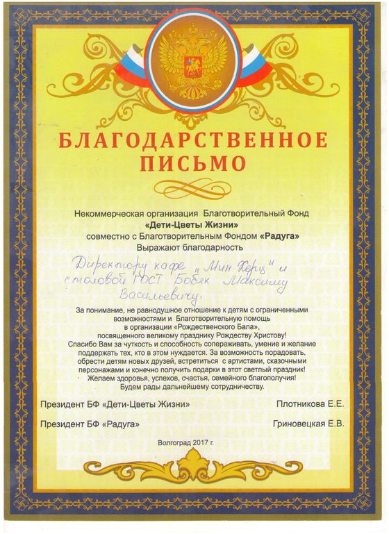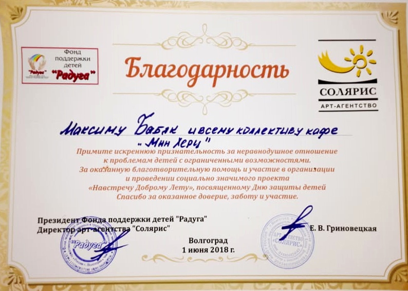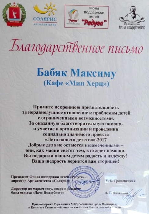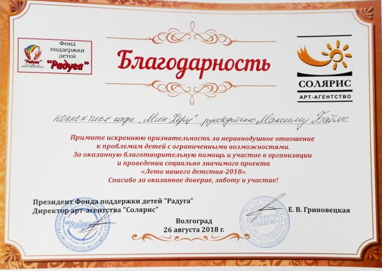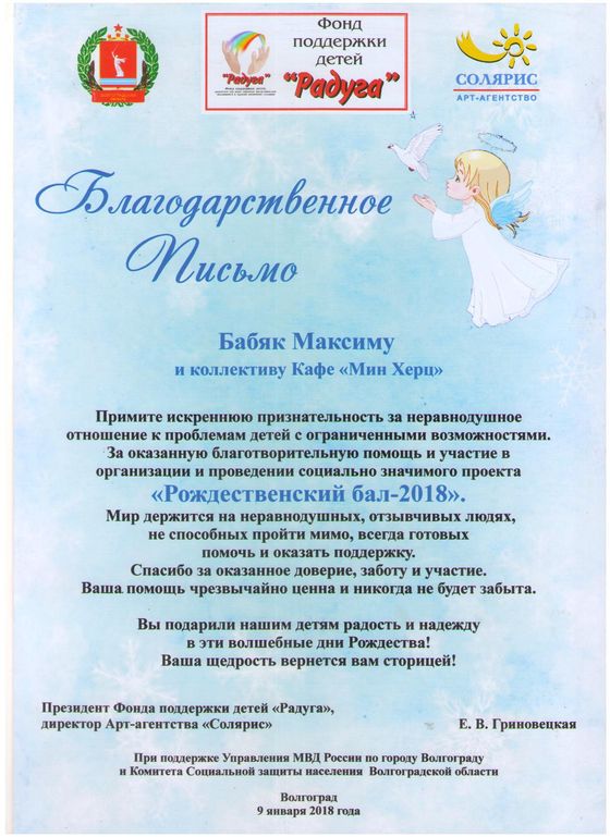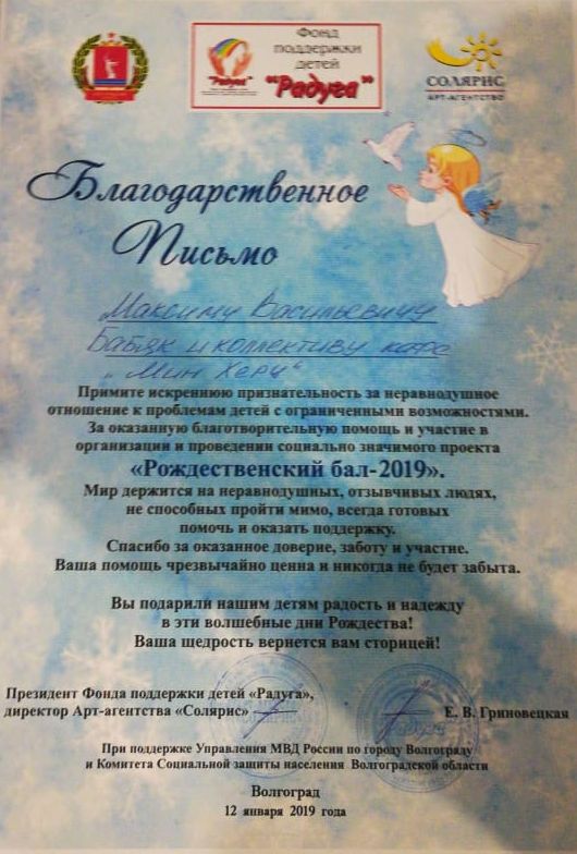 «Мин Херц» совместно со столовой «ГОСТ» постоянно сотрудничает с Волгоградской региональной организацией Всероссийского общества слепых. Помогает им в проведении различных мероприятий: дня знаний, Нового года, Масленицы и других праздников. Это своеобразная дань уважения, поддержки и сострадания плоховидящим людям.