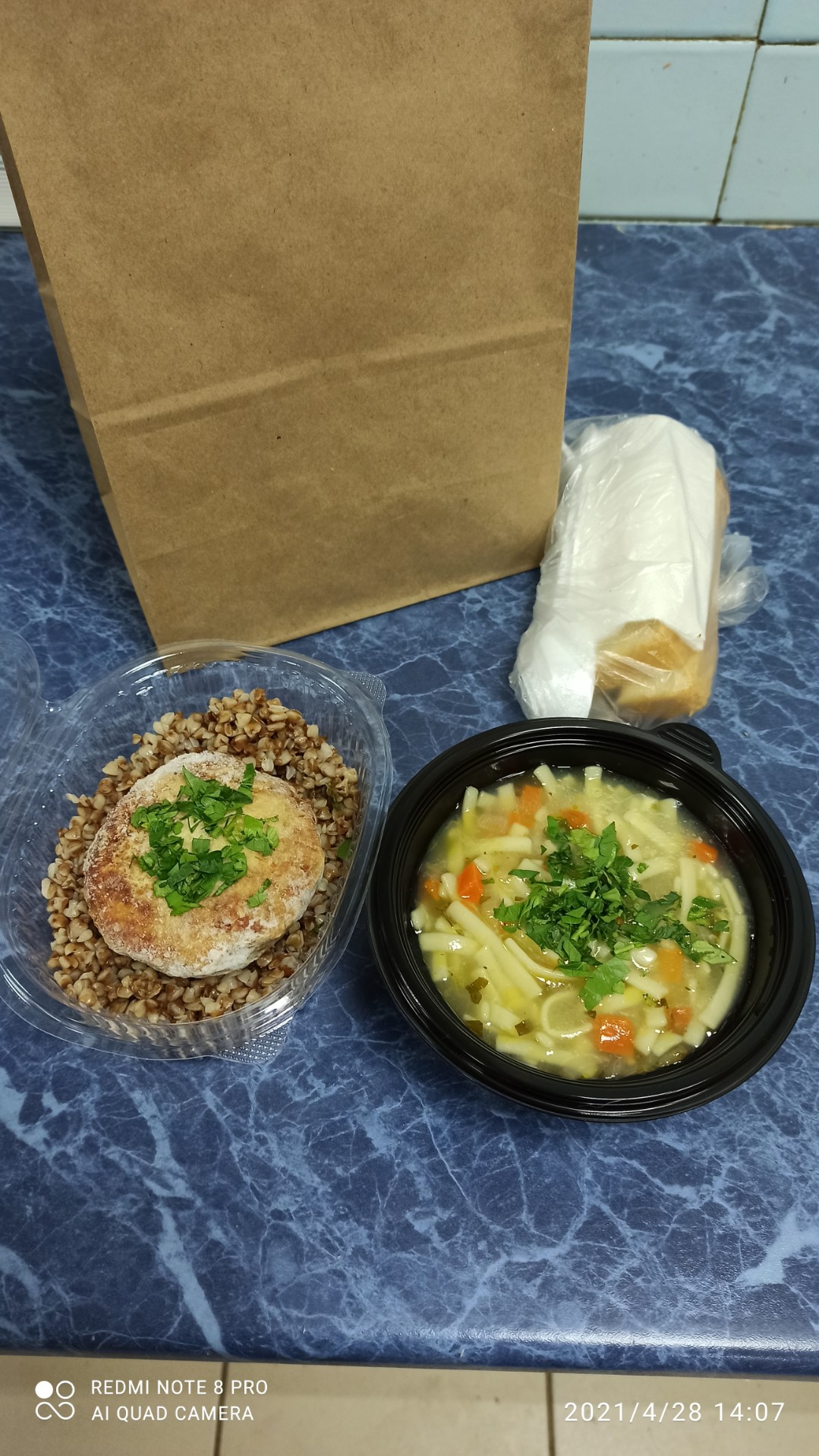 Суп-лапша грибн - 250г( куриный бульон, лапша, шампиньоны, лук, морковь, специи), Котлета Венская-100г( куриное филе, лук, копченый сыр, специи), Гречка - 150г, Хлеб - 2 кус, приборы и салфетки