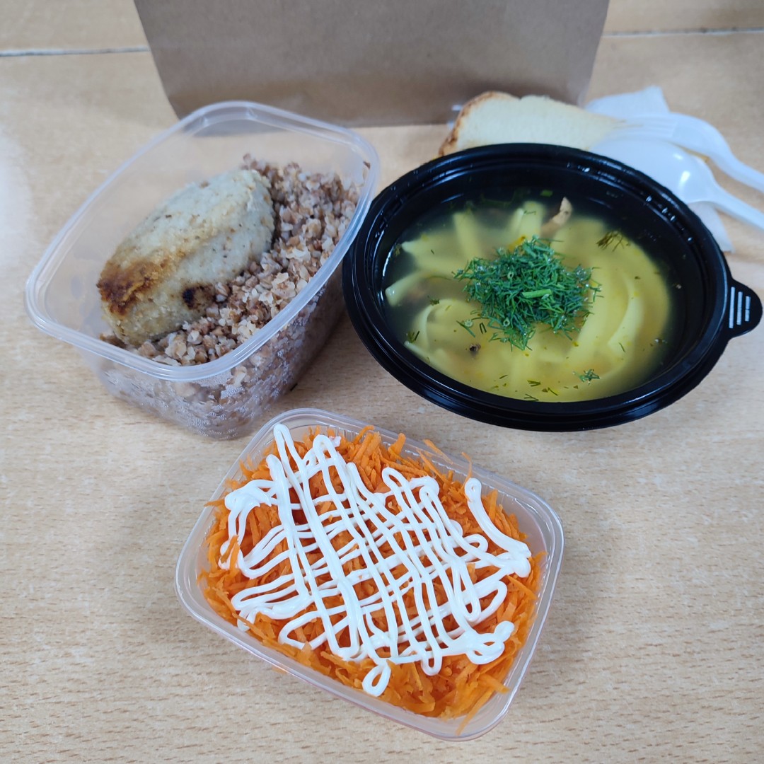 Суп-лапша грибн - 250г ( куриный бульон, лапша, шампиньоны, лук, морковь, специи), Салат Морковь с майонезом - 120г, Котлета Венская - 100г ( куриное филе, лук, копченый сыр, специи), Гречка - 150г, Хлеб - 2 кус, приборы, салфетки.