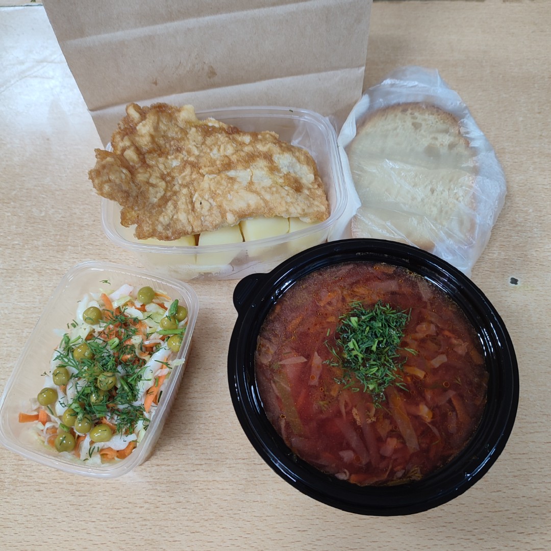 Щи из свеж. капусты - 250г( куриный бульон, картофель, капуста, лук, морковь, томатная паста, специи), Салат Витаминный - 120г ( свежая капуста, морковь, специи), Картофель отварной - 200г, Куриное филе в белках - 100г, Хлеб - 2 кус., приборы, салфетки.