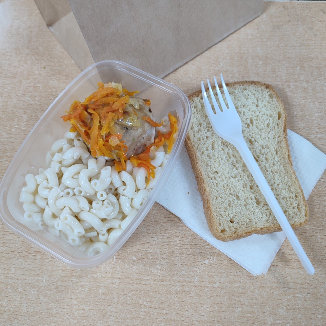 Тефтеля (60г) (свинина, курица, рис, томатный соус с луком и морковью) макароны (150г) Хлеб 1 кус., приборы, салфетки.