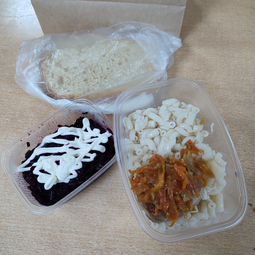 Салат из свеклы с майонезом (120гр.) тефтеля (свинина, курица, рис, томатный соус с луком и морковью) (60гр.) макароны(150гр.) Хлеб 1 кус.., приборы, салфетки.