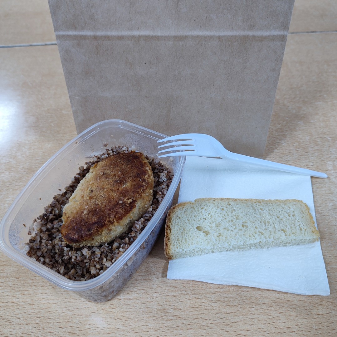 Котлета "Венская" 100г (куриное филе, лук, специи, копченый сыр) гречка (150г) Хлеб 1 кус., приборы, салфетки.