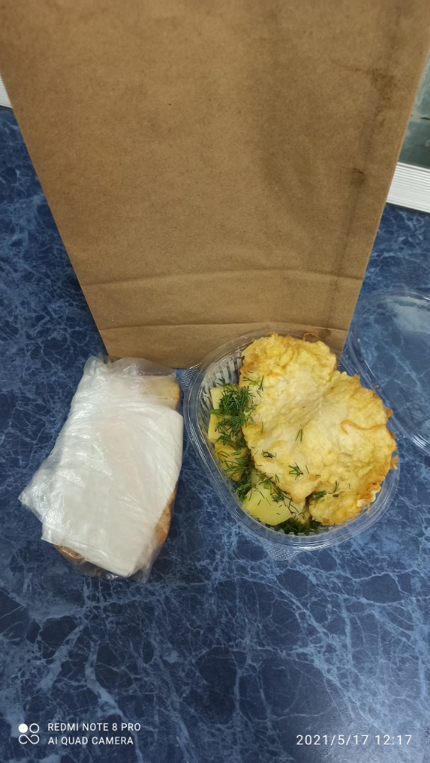 Куриное филе в белках (100г) картофель отварной (200г) Хлеб 1 кус., приборы, салфетки.
