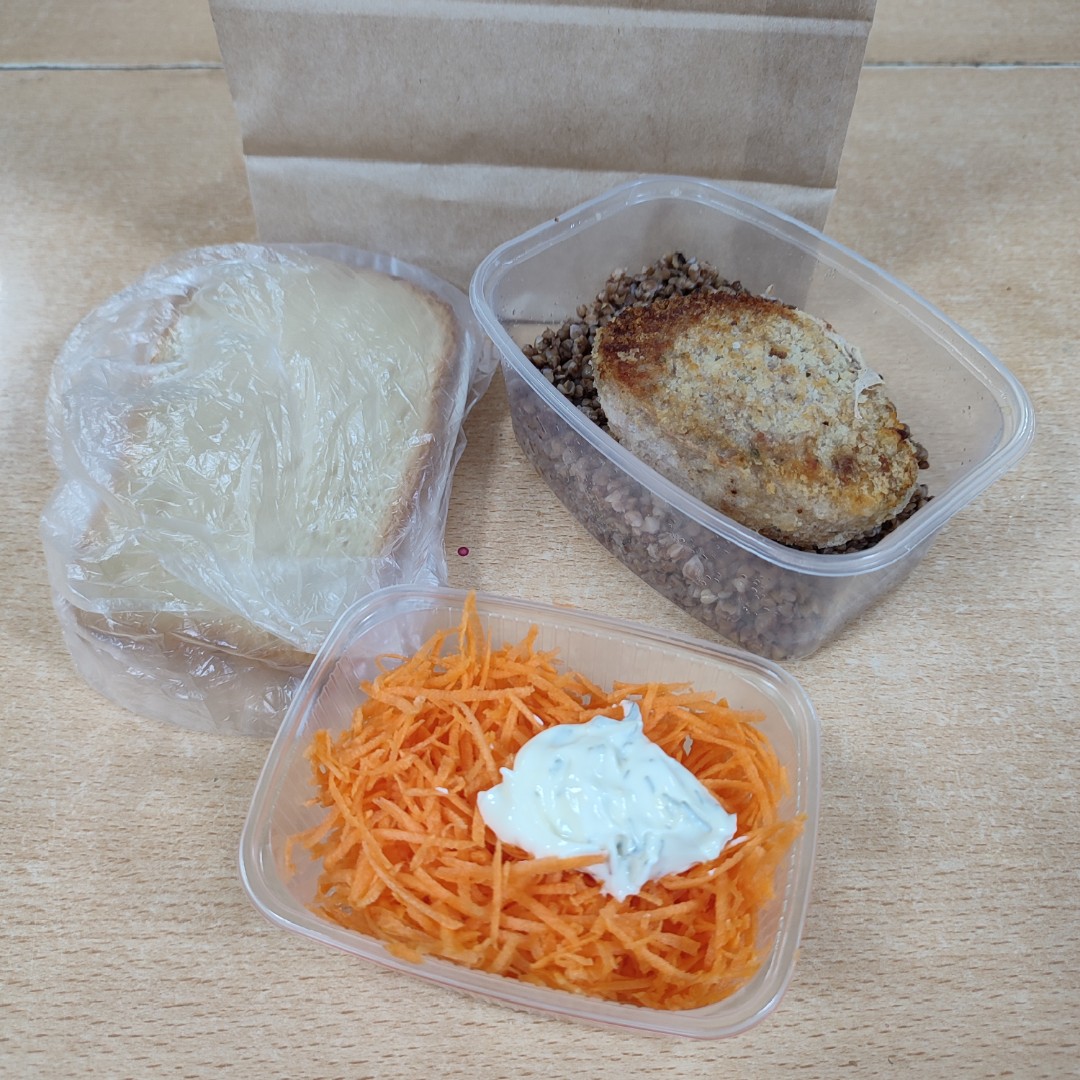 Салат Морковь с майонезом (120гр.) котлета Венская (100гр.) (куриное филе, лук, специи, копченый сыр), Гречка (150гр.) Хлеб 1 кус., приборы, салфетки.