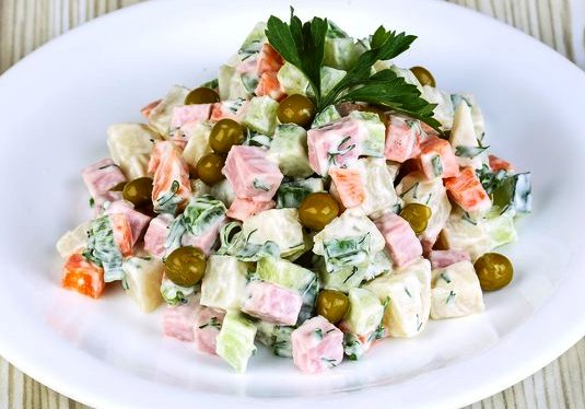 Колбаса, картофель, морковь, зеленый горошек, огурец соленый, яйцо, майонез.