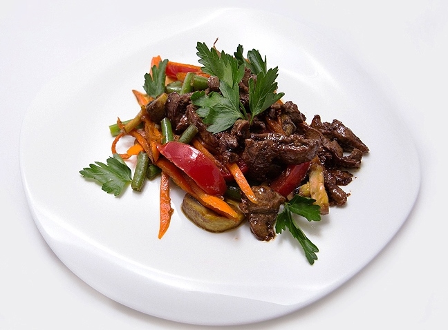 Печень, фасоль стручковая, грибы, помидор, лук порей, морковь. Энерг. ценность на 100 гр - 210 Ккал