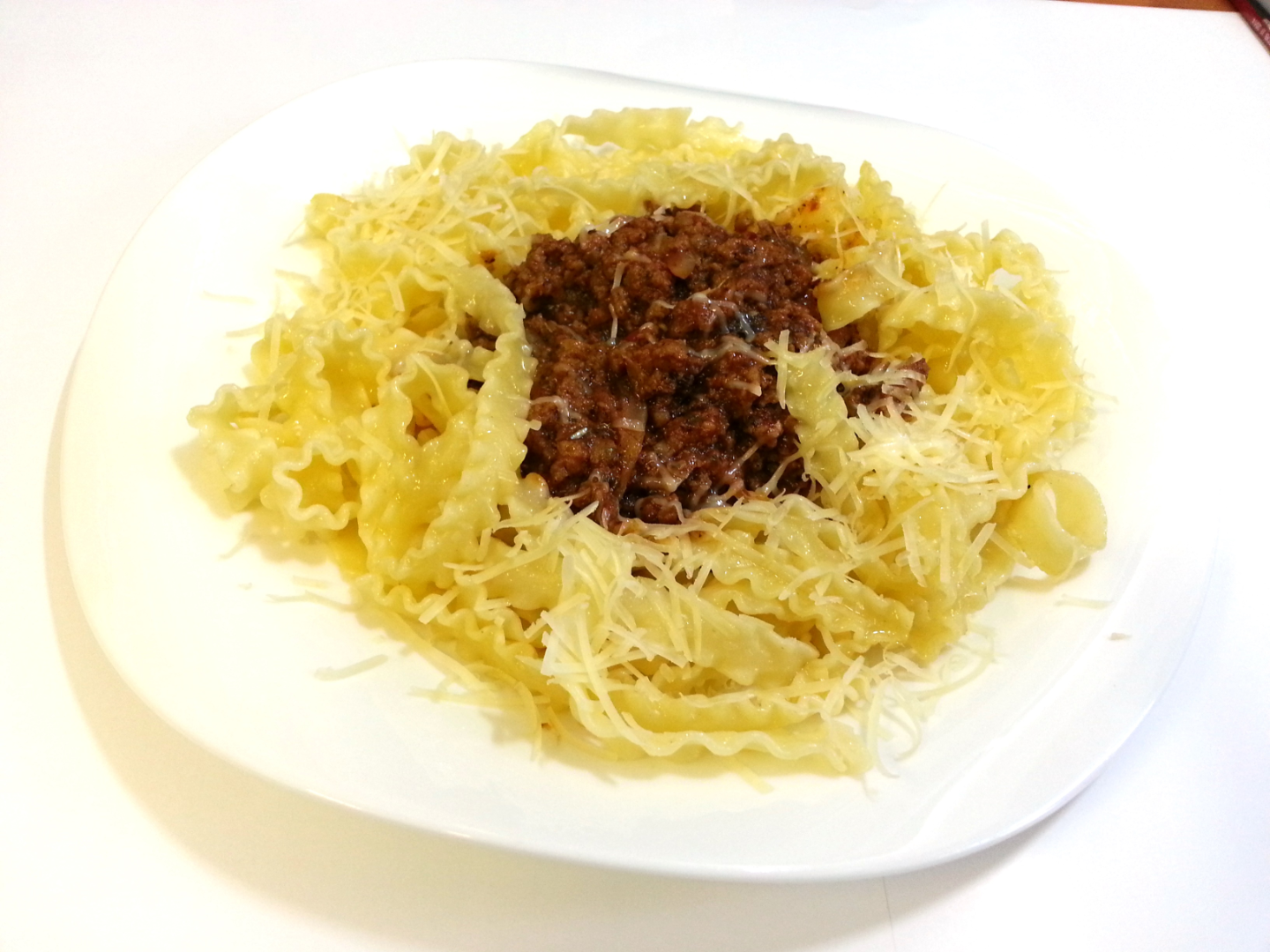 Паста, говядина, томатный соус, болгарс. перец, сыр Пармезан. Энерг. ценность на 100 гр - 380 Ккал