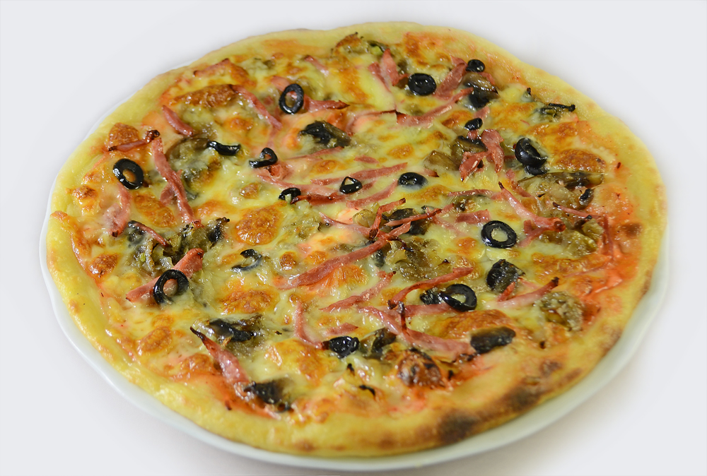 Ветчина, моцарелла, грибы, лук, оливки. Энерг. ценность на 100 гр - 228 Ккал