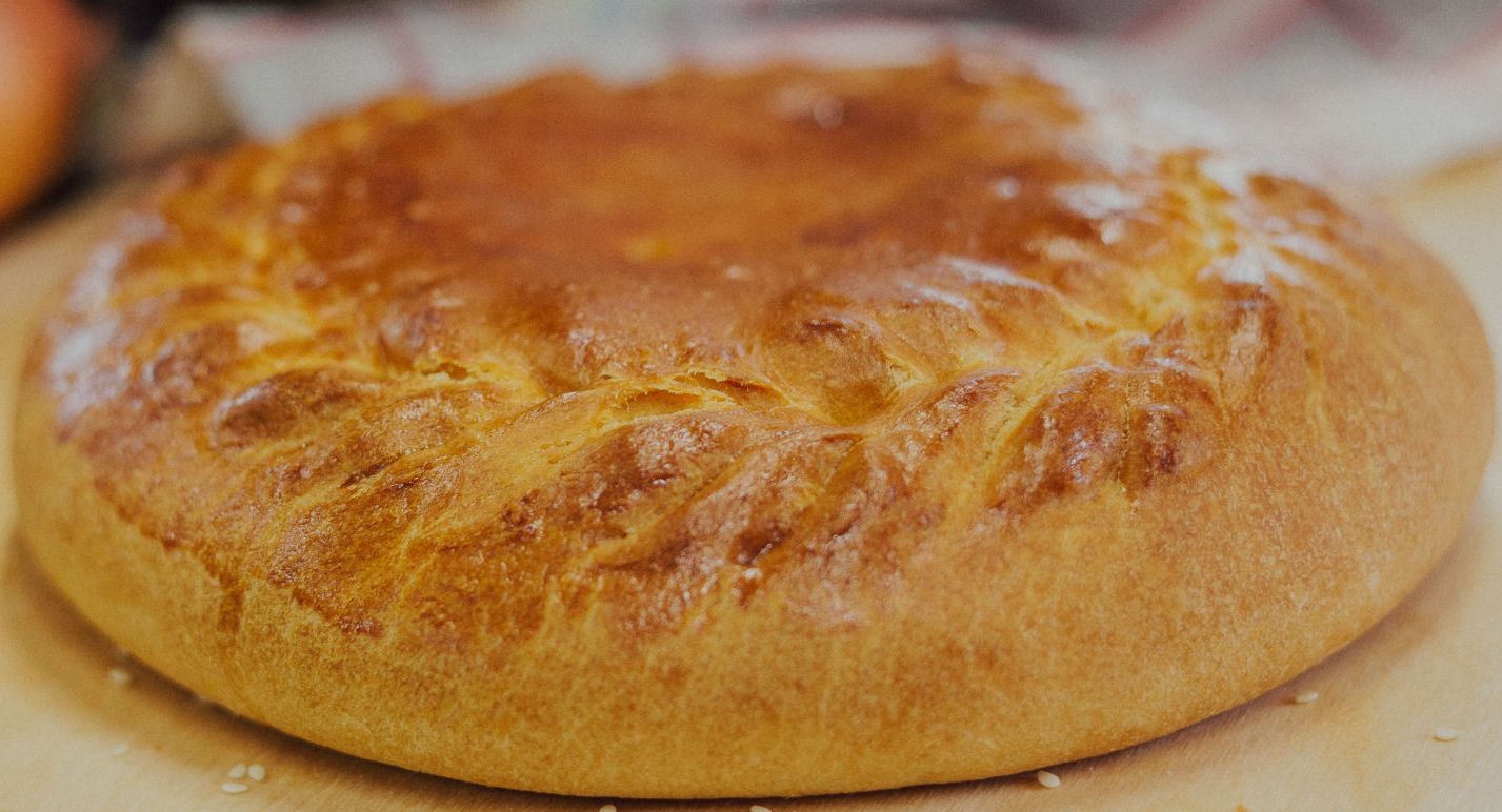 Сдобный пирог с начинкой из курицы, отварного риса, моркови и репчатого лука