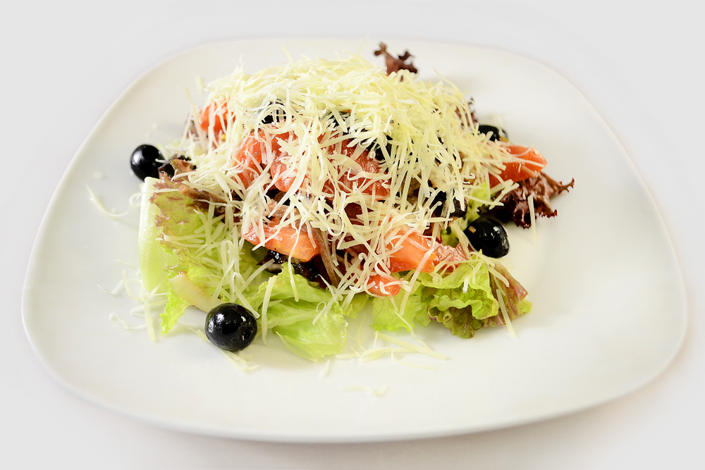 Язык говяжий, чернослив, помидор, салат, сыр «Пармезан», маслины, лук маринованный, чеснок, оливковое масло. Энерг.ценность на 100 гр - 230 Ккал