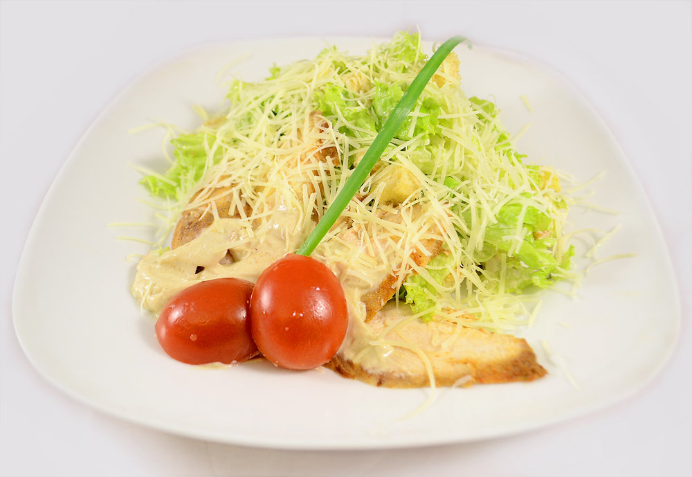 Куриное филе, помидоры, салат, крутоны, фирменный соус. Энерг.ценность на 100 гр - 179 Ккал