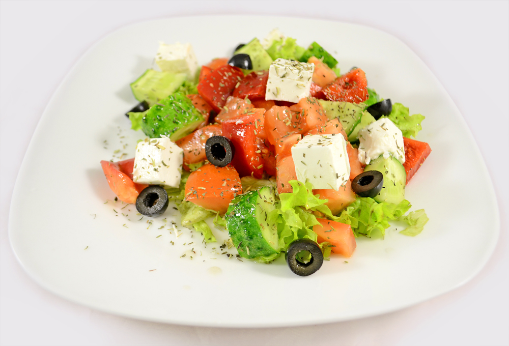 Помидоры, перец, огурцы, сыр, оливки, оливковое масло, сок лимона. Энерг.ценность на 100 гр - 52 Ккал