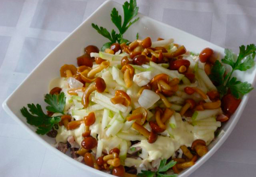 Салат из квашеной капусты с маринованными грибами, заправляется растительным маслом