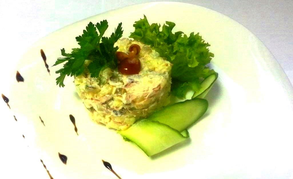 Язык говяжий, огурец маринованный, грибы маринованные, картофель отварной, огурец свежий, чеснок, майонез. Энерг.ценность на 100 гр - 198 Ккал