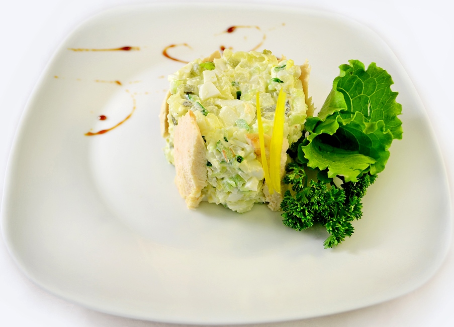 Курица, картофель, яйцо, огурец свеж., огурец солен., майонез. Энерг.ценность на 100 гр - 217 Ккал