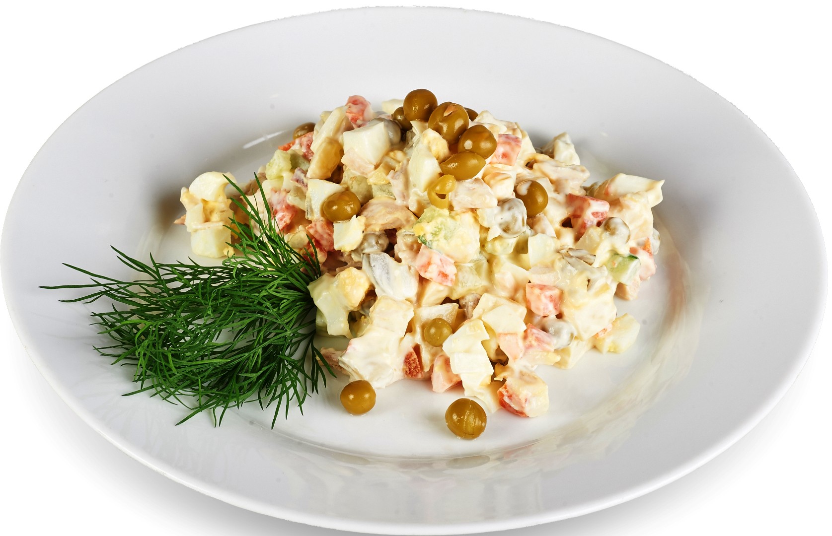 Курица отварная, картофель, морковь, зеленый горошек, огурец соленый, яйцо, майонез.
