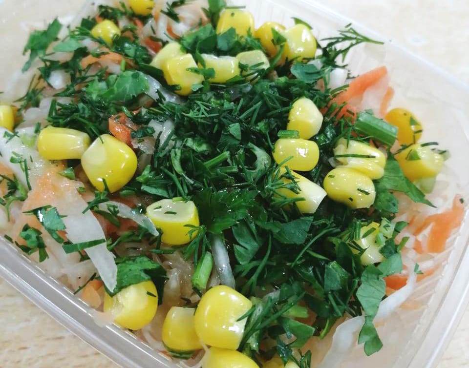 Салат из свежей капусты, моркови, с добавлением кукурузы, заправляется растительным маслом