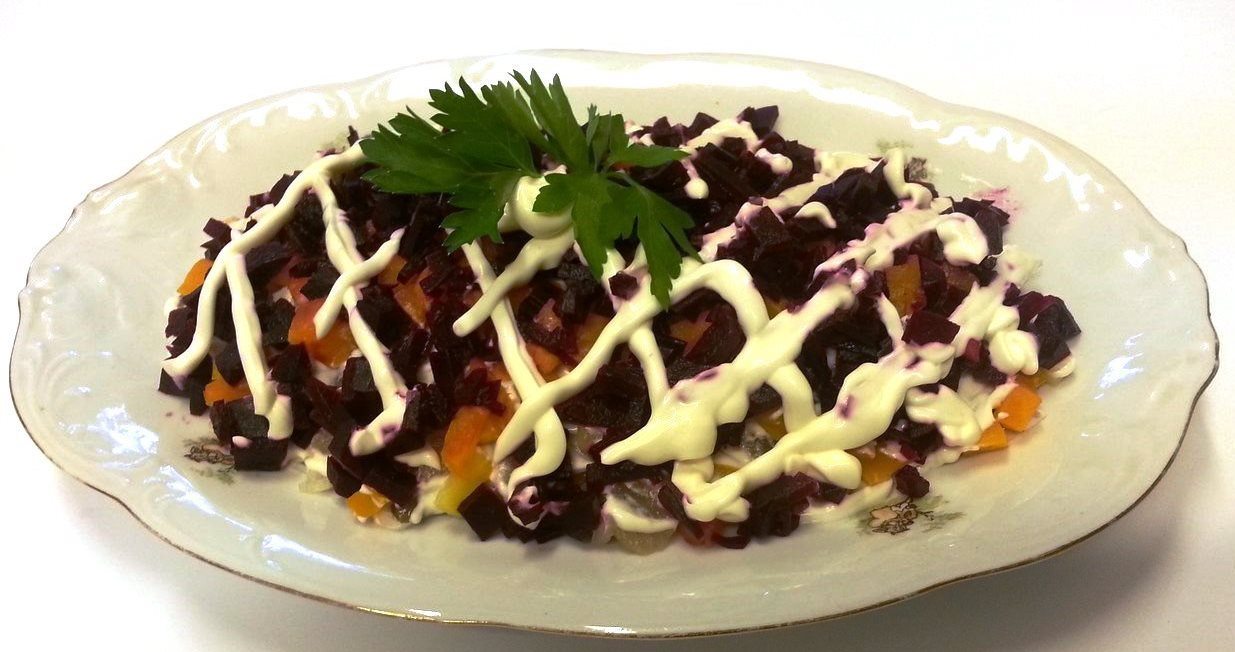 ЗАКАЗ ОФОРМЛЯЕТСЯ ЗА ДЕНЬ ДО ДОСТАВКИ. Сельдь, картофель, морковь, свекла, мар.огурец, лук репчатый, майонез. Энерг.ценность на 100 гр - 187 Ккал