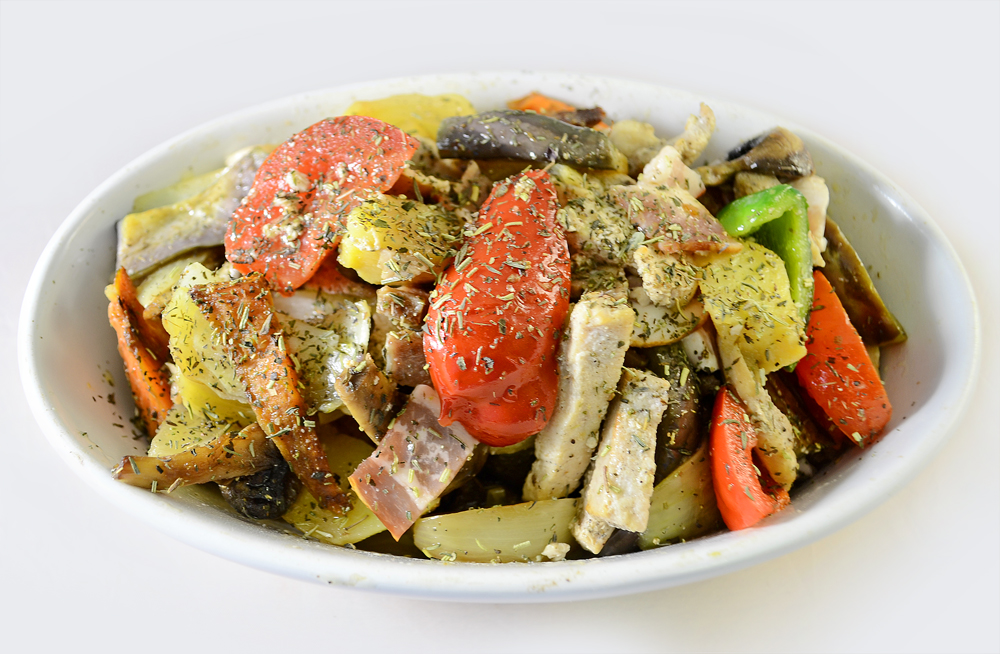 Четыре вида мяса, картофель, помидоры, баклажан, болгарский перец, грибы, морковь, лук, чеснок. Энерг. ценность на 100 гр - 384 Ккал