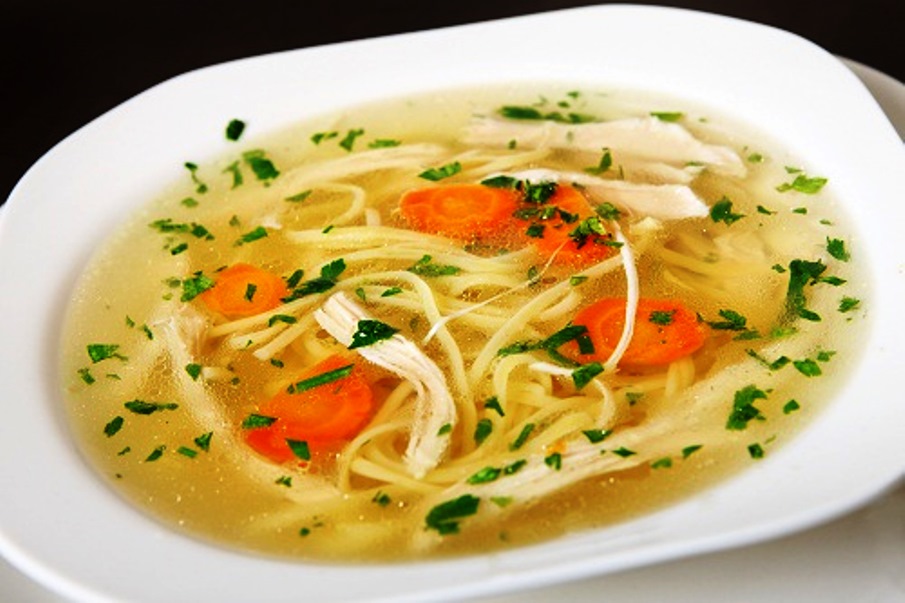 Бульон куриный, лапша, лук, морковь, куриное филе, специи
