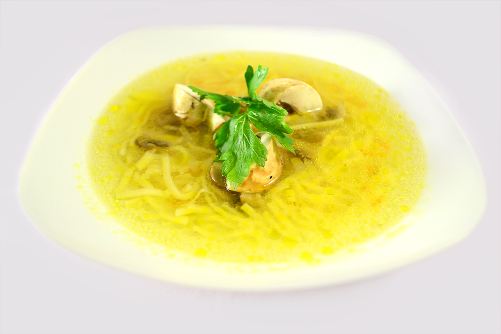 Куриный бульон, лапша яичная, шампиньоны, лук, морковь, зелень. Энерг.ценность на 100 гр - 42 Ккал