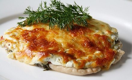 Свиной карбонад, запеченный под сыром с картофелем, свежими помидорами, майонезом
