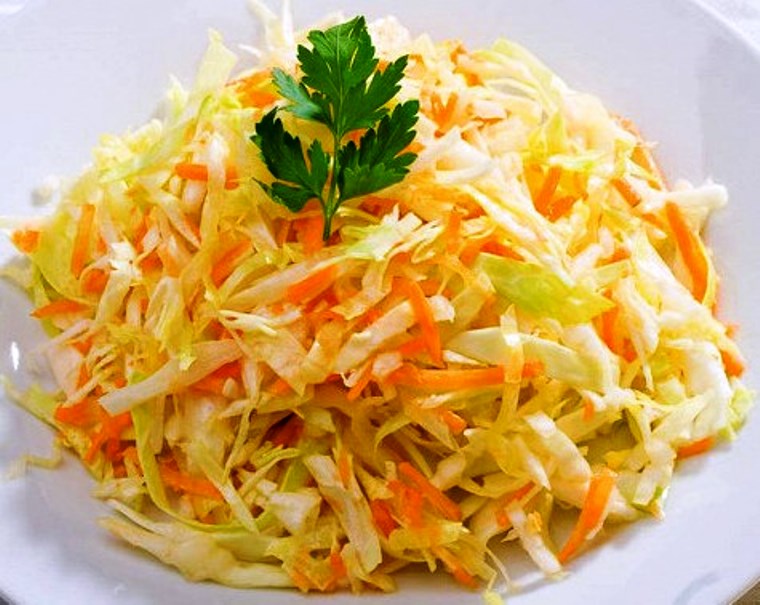 Салат из свежей капусты, моркови, с добавлением зеленого горошка, заправляется растительным маслом